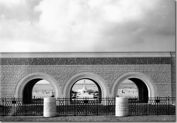 The name panels are of Portland stone and the cloisters are of limestone quarried nearby. This is desert country, but beds of roses front the memorial. Water from tanks along the nearby railroad and stored in underground reservoirs, ensures an oasis-like atmosphere. A short approach road, marked by the Commonwealth War Graves Commission, leads to the Memorial site off the main desert highway.