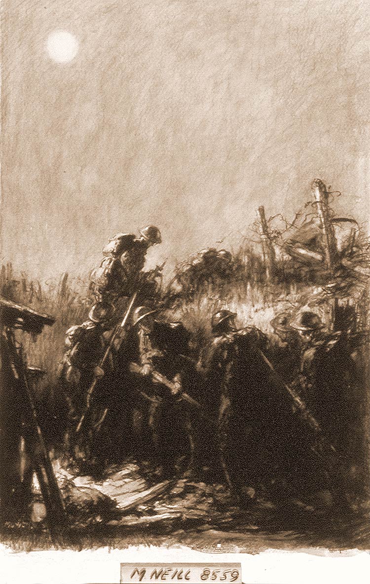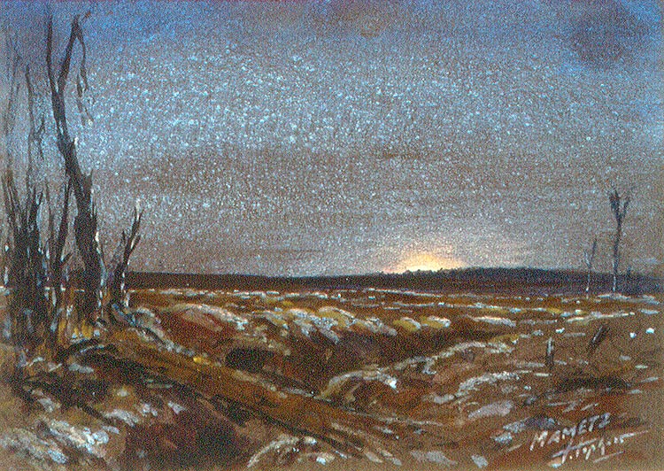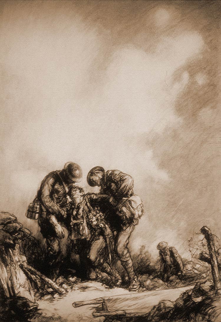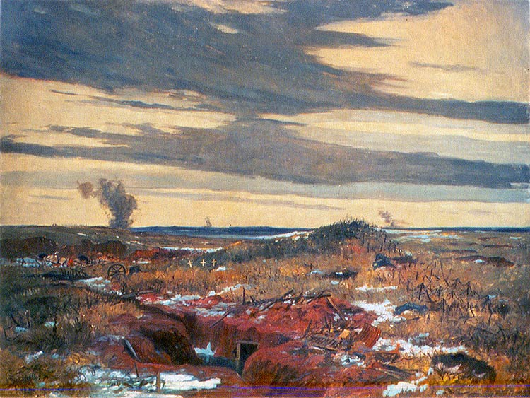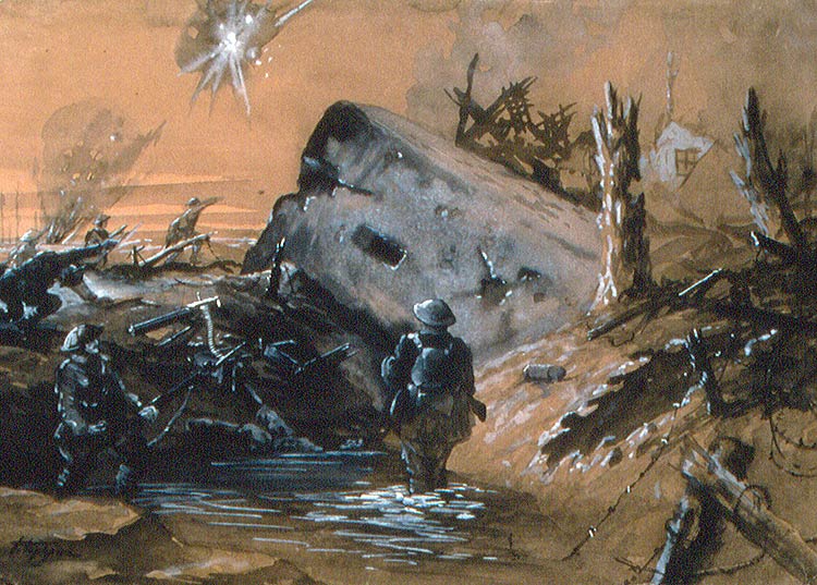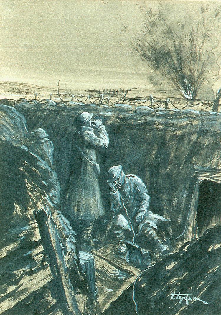 Life for soldiers in the trenches was miserable. They were often muddy and cold and had to live in the midst of pests like rats, lice and fleas. In this form of warfare, soldiers faced the enemy across a narrow strip of land between the opposing trenches. This was a harsh "No Man’s Land" of mud, barbed wire and shell craters, swept by machine gun fire, and menaced by artillery and snipers. This is what soldiers had to cross when they went "over the top" and launched an attack. The dead and injured who fell in No Man’s Land often could not be recovered.