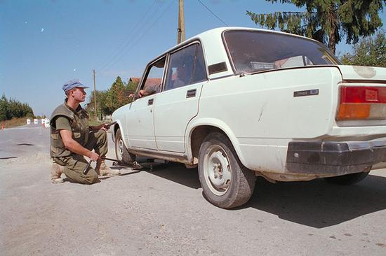 With the aid of a mirror, Sergeant Eric Bernier of 1st Battalion, Royal 22e Régiment checks under the vehicle at the check point just outside Lipik, Croatia. Photo: Department of National Defence