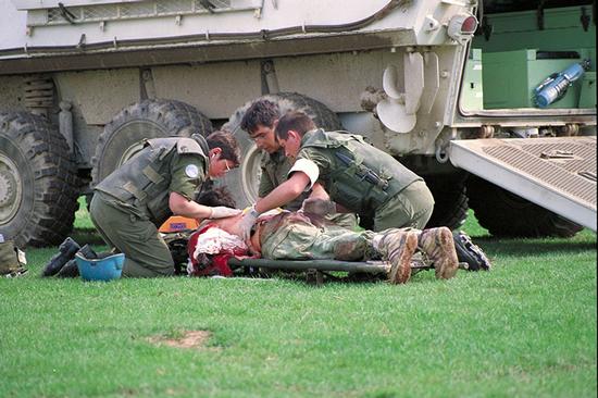 Major Hillary Jaeger, Sergeant Danny Noyes and Corporal Phil Fewer of Second Canadian Battalion Field Surgical Team treat a mortar casualty prior to transport to Camp Visoko Hospital. Photo: Department of National Defence