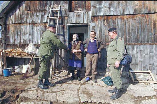 Master Corporal Logan, with the help of a translator, is delivering humanitarian goods such as flour and some pots to cook with to some elderly returnees to the Glamoc area. Photo: Department of National Defence