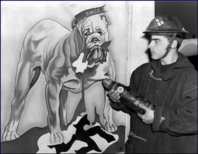 As a way to build crew morale and help create a sense of identity for each ship during the Second World War, most RCN corvettes (anti-submarine escort vessels) had their own unique emblem painted on their gun shields. Pride and creativity were key, so there were a wide variety of designs. The crew of HMCS Sackville had Donald Duck for an emblem, HMCS Summerside had Micky Mouse and HMCS Shawinigan had a bulldog tearing apart the Nazi flag.