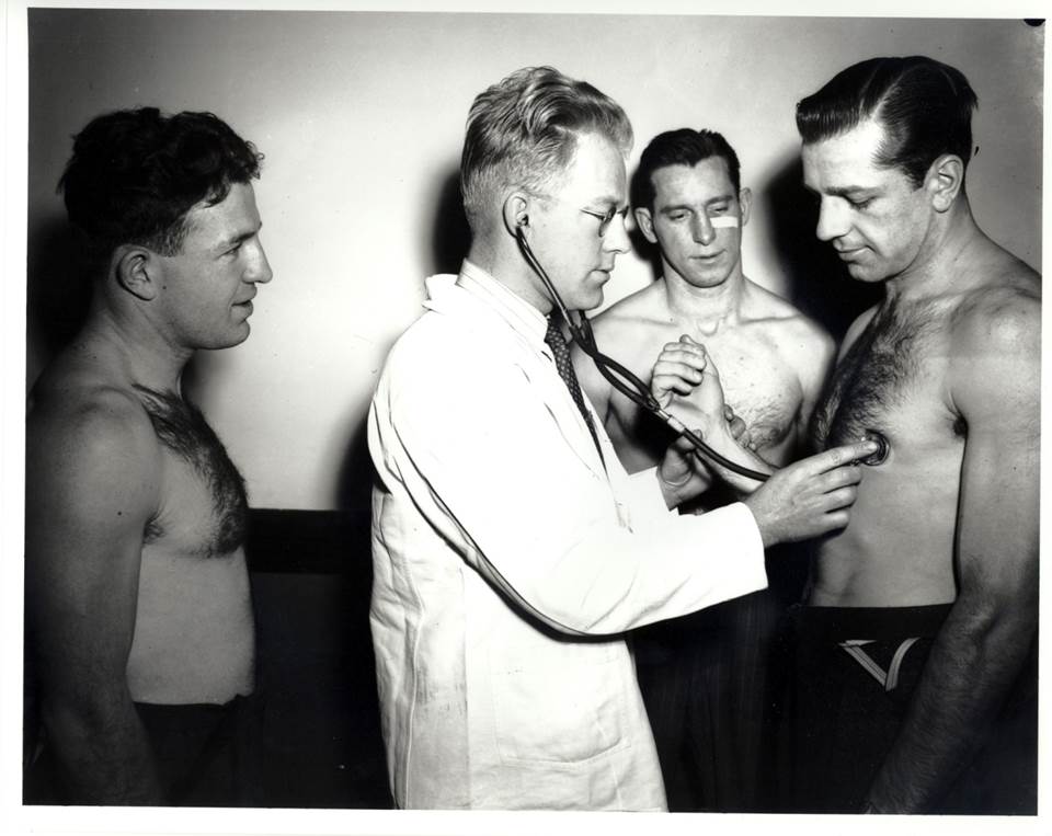 Boston Bruins Hockey Club front line Bobby Bauer, Porky Dumart and Milt Schmidt, who left hockey to become members of the RCAF, seen taking their medicals in 1942.