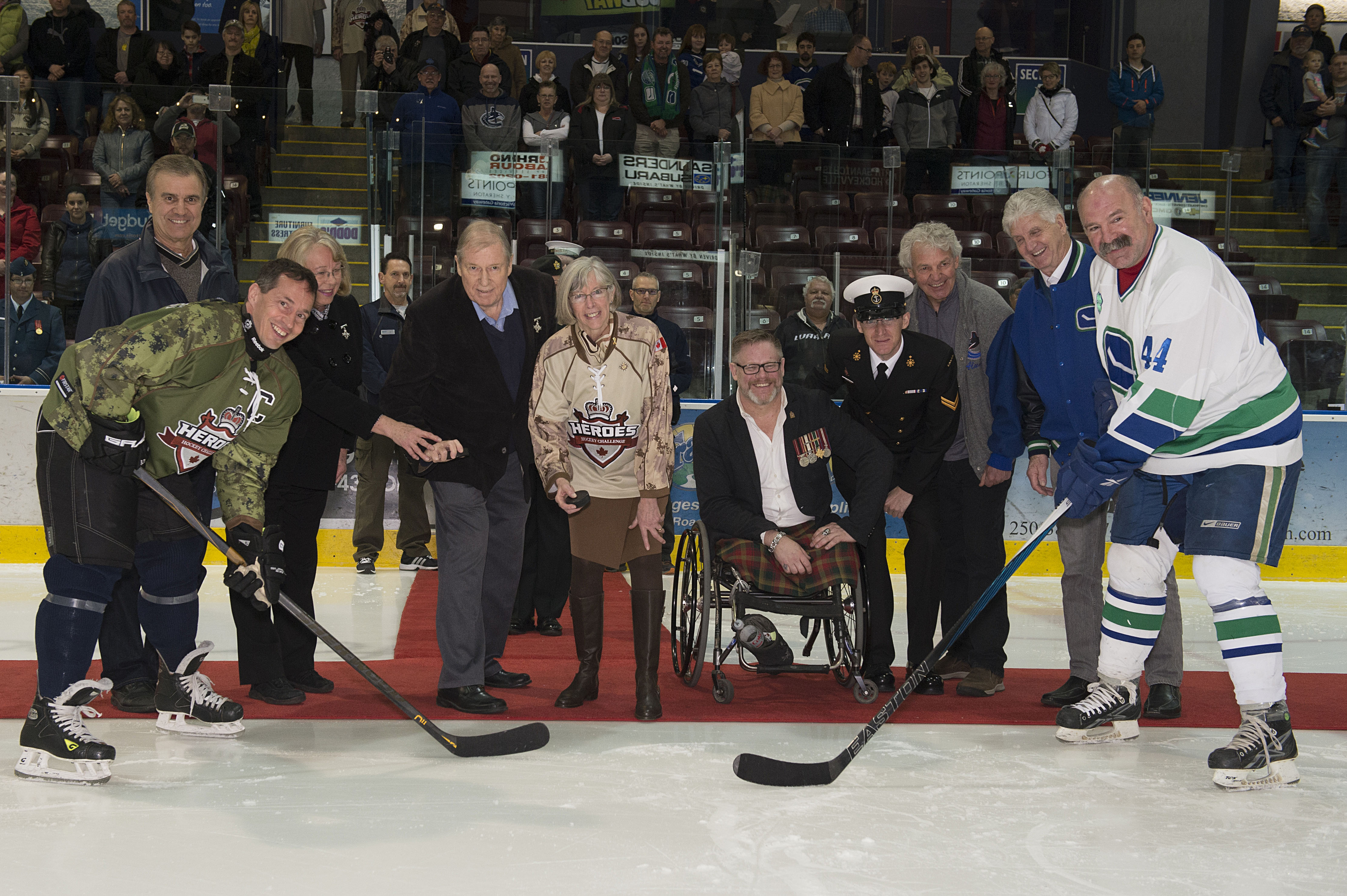 Today, many NHL teams have special games to honour the men and women in the Canadian Armed Forces. It is common to see professional athletes wear camouflage jerseys in warm-ups before those games and goaltenders sometimes play with specially-painted helmets that pay tribute to military members. Junior hockey teams design commemorative hockey jerseys, especially when playing in the Memorial Cup tournament. Ceremonial puck drops involving our men and women in uniform are held across Canada at all levels.