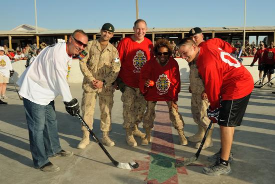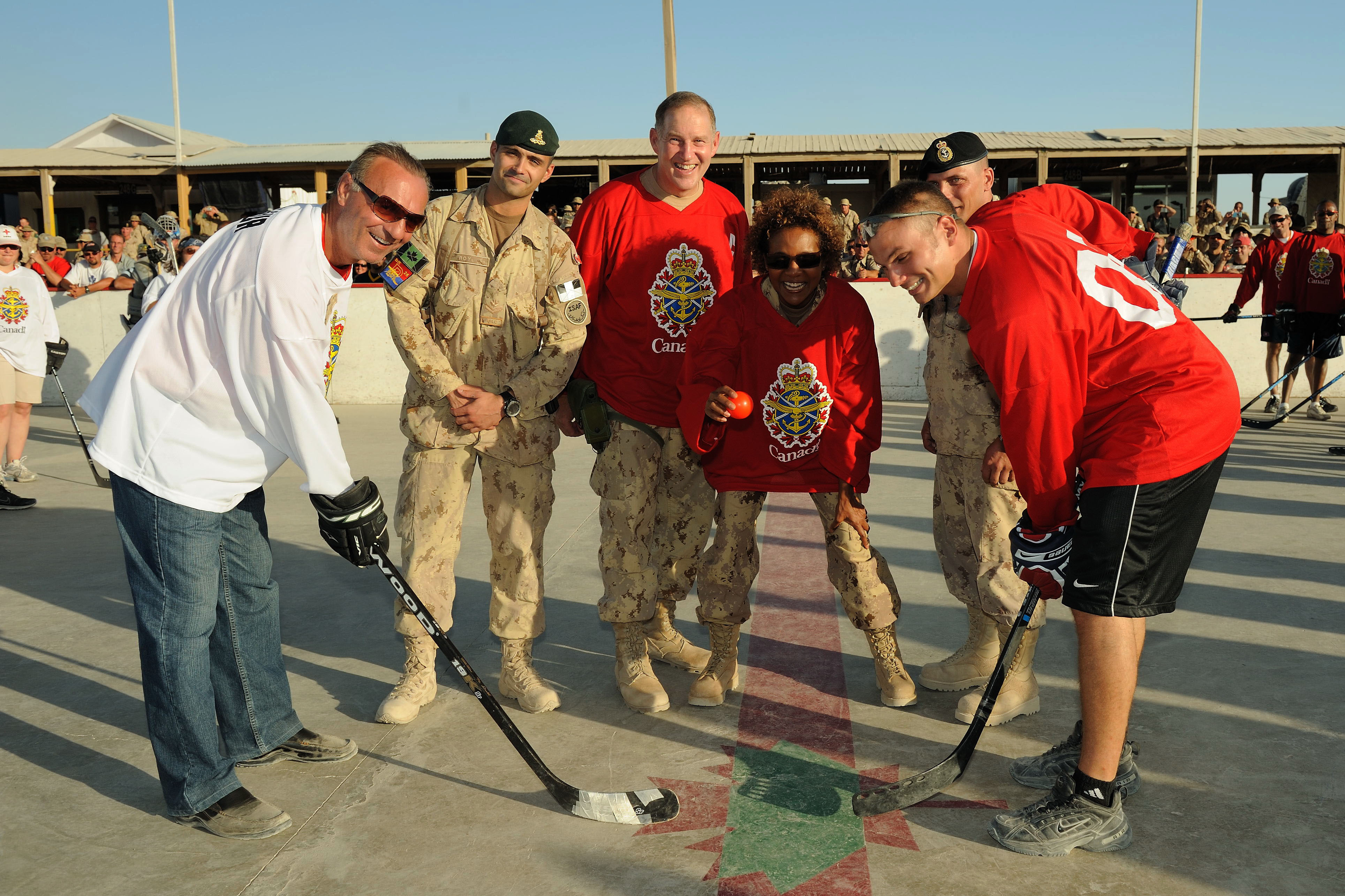 During the post-war years, many military bases across Canada built rinks to allow soldiers, sailors and airmen to play hockey for recreational and training purposes. Not surprisingly, the old military-hockey connection has continued in more recent times. Hockey sticks are sometimes packed when Canadian troops deploy in conflict zones. For example, in Kandahar, Afghanistan, where temperatures often reach 40°C, Canadian Armed Forces members built ball-hockey rinks. They played mostly at night, when the cooler temperature allowed for a faster-paced game. Former NHL players and celebrities like Guy Lafleur, Lanny MacDonald, Bob Probert and Don Cherry even went overseas to visit the troops, some of them playing exhibition games in mixed teams made up of hockey legends and serving members. But a hockey game wouldn’t be the same without referees, so former NHL officials were also on site to oversee the game!