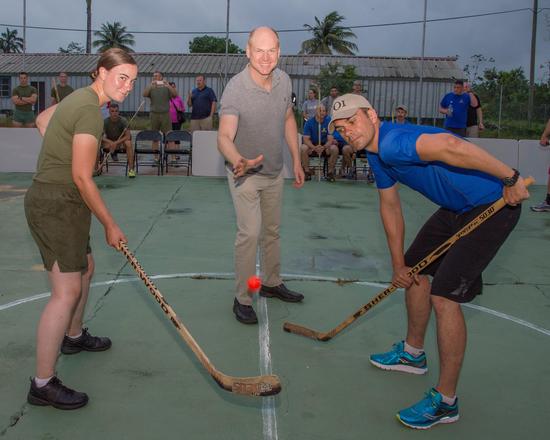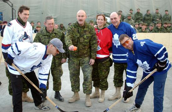 The Right Honourable Michaëlle Jean, and General Natynczyk do the face-off of the Team Canada ball hockey game with Guy Lafleur and Corporal Grondin of 438 Tactical Helicopter Squadron in Afghanistan in 2008.