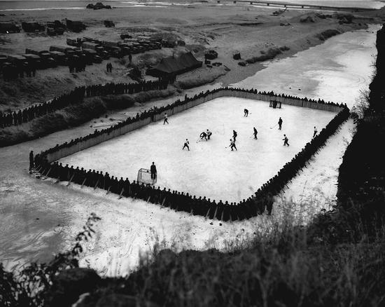 Some 400 spectators watch the 26 Canadian Infantry Brigade championship hockey game at Imjin Gardens in Korea in 1953.
