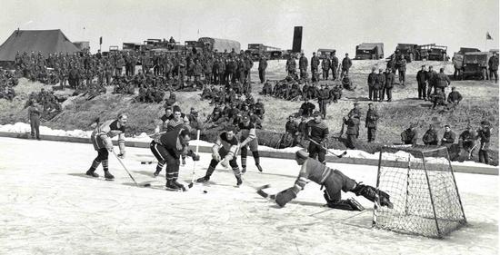 Our Canadian service members’ love of blending hockey with military service would continue in the Korean War. As the conflict progressed and the front lines became more stationary, our soldiers would find a way to play hockey in the Far East. During the colder months, they would clear the snow covering the ice on the Imjin River and play as the sound of artillery fire boomed in the distance.