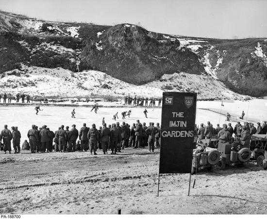 Imjin Gardens is the scene of a hockey game between teams of the Royal Canadian Horse Artillery officers and "Van Doos" officers in Korea in 1952. Photo: Library and Archives Canada PA-188700