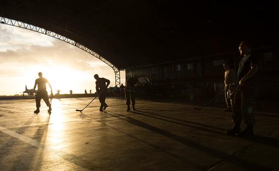 Members of Air Task Force - Iraq take part in a ball hockey game at Camp Patrice Vincent, in Kuwait during Operation IMPACT in 2015.
