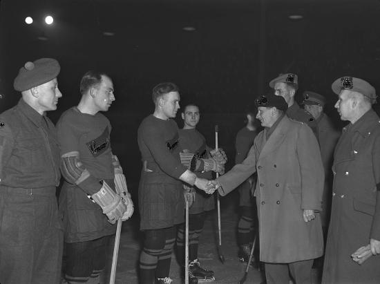 Some players, like Maurice “Rocket” Richard, could not enlist because of injuries they had received during their hockey careers. Other players enlisted but did not make it to the front lines. Having them play hockey either in Canada or in military camps overseas proved to be a pillar of strength for both civilians and the military. Highly competitive regimental hockey teams were formed, serving such purposes as keeping the men fit and entertaining the serving members on military bases.
