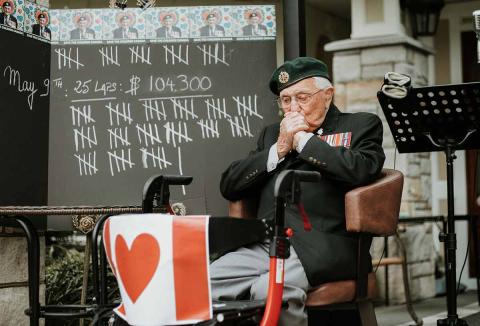 He would walk five laps of the Carlton House retirement residence courtyard daily, with his progress posted to the Carlton House Facebook page. The goal was clear: the 101 year old Veteran would walk a total of 101 laps, in the hopes of raising $101,000 towards the Save the Children Canada’s Emergency COVID-19 relief fund. The relief fund helps children and their families to afford basic essentials such as food and healthcare.