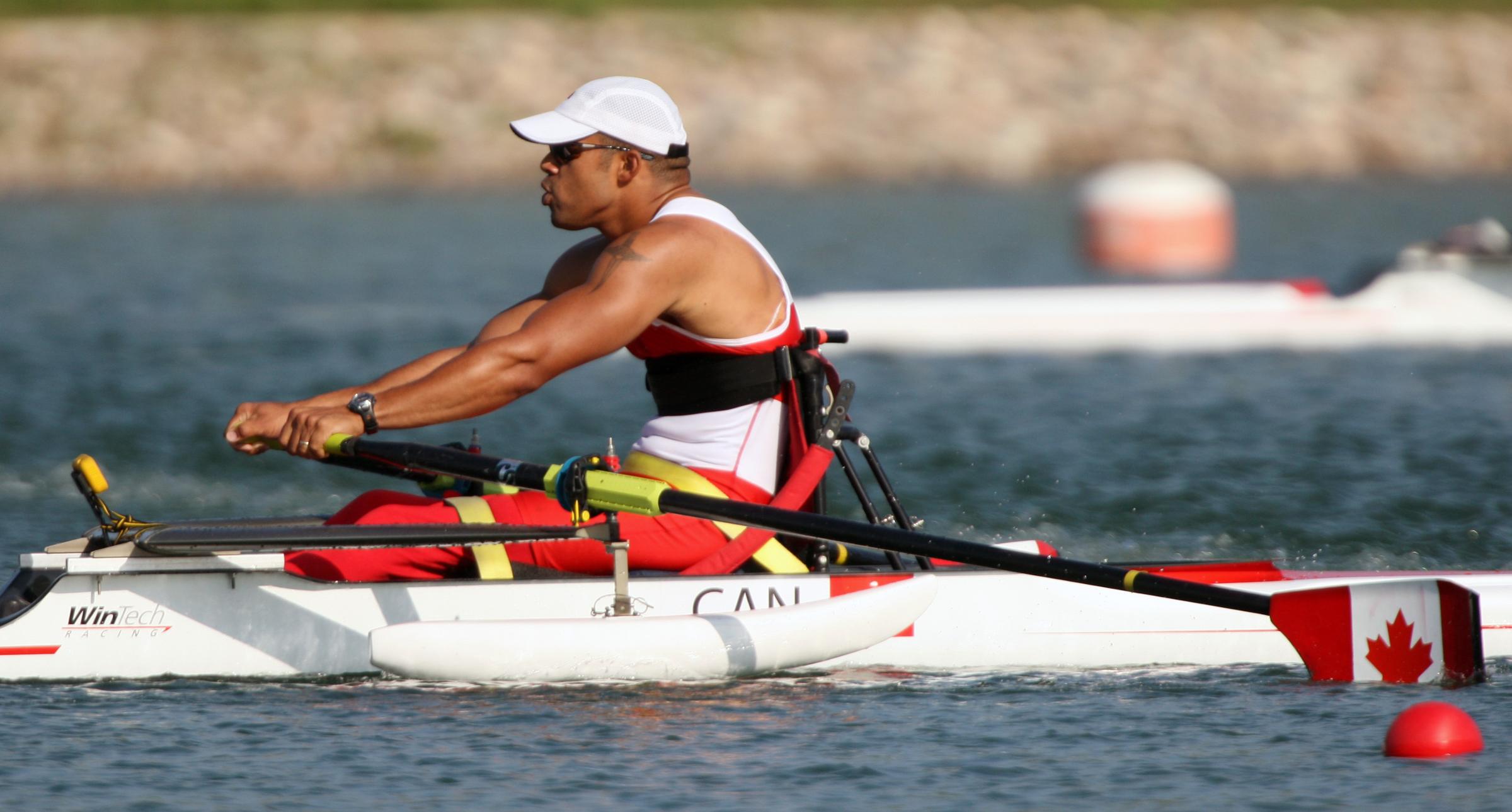 Steve competes in the men's single sculls in rowing action at the Paralympic Games in Beijing (10 September 2008). Photo: Canadian Paralympic Committee.