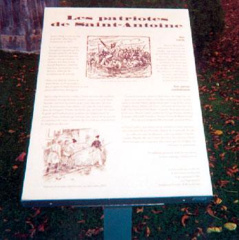 In November 1837, some 250 Patriots gathered in Saint-Antoine and crossed the river to fight at Saint-Denis, answering a call from George-Étienne Cartier, one of Papineau’s lieutenants. The obelisk is made of wood and measures approximately 20 feet high, with a cement base on which have been installed three plaques bearing the names of the 15 known Patriots from Saint-Antoine. It also bears the Saint-Antoine coat of arms. The memorial was erected on May 24, 1987 by the 150th anniversary municipal commission.