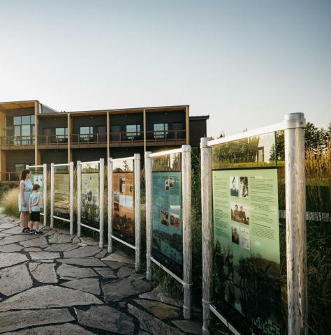 Glass didactic panels face the walkway that leads to the monument. Stories and illustrations on the didactic panels describe the battles and wars that Métis people were involved in, beginning with the Battle of Seven Oaks through to the current Peacekeeping times. The imagery of which, depending on the time of day, silhouette against the grass or pathway. As more information comes over time the glass panels on the monument and didactic panels can be recycled and reprinted in order to update information such as the inclusion of more Métis Veteran names.
