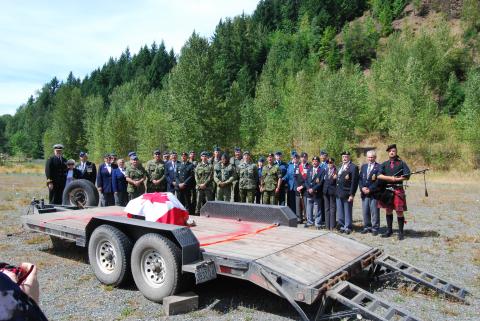 In 1983 Air Cadets from 861 Silverfox Squadron in Abbotsford, under Commanding Officer Chris Weicht, constructed a memorial cairn beside Airplane Creek incorporating one of the Liberator’s engines. In 2013 Air Cadets from 147 Airwolf Squadron in Chilliwack, under the command of Capt. Ted Bowman and supervised by Lt. (N) Ron Shore, found the1983 memorial face down and unrecoverable in Airplane Creek. Plans were made at that time to build a new memorial. On July 14, 2015, this engine was recovered from the crash site.