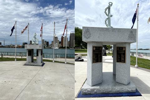 During 2016 to 2018, the monument underwent a complete restoration which included the addition of two bronze plaques to honour the Royal Canadian Navy ships lost during the Battle of the Atlantic and was updated to honour those who served during the Cold War and in Afghanistan. Five new flag poles were added to display the evolution of the Canadian Naval “Suite of Colours” on His Majesty’s Canadian Ships (warships) – the Blue Ensign 1911 – 1965; the White Ensign 1911 – 1965; the Canadian Maple Leaf 1965 – Present; the Canadian Naval Ensign 1968 – Present and the Red Ensign of the Merchant Navy of Canada. The surrounding plaza was significantly expanded by the City of Windsor during the reconstruction of the adjacent river-walk to include new planters and landscaping. The monument was rededicated on May 6, 2018.