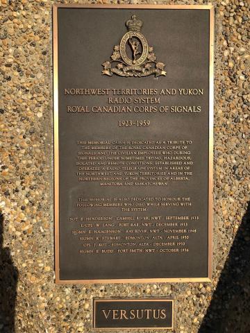 A sculpted triple V monument detailing a brief role and history of the Northwest and Yukon Terrorties Radio System and the importance it played in the develpoment of the north and to its population. In additon to the direct support to the polulace and develpoment of Canada's north, the names of soldiers,signallers and civilians who lost their lives during their employment within the Radio System are emblazoned on the monument.