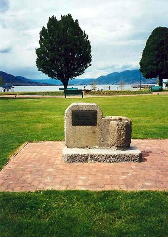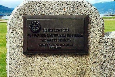 This memorial park, marked by a concrete stele and fountain, was erected by the Rotary Club of Penticton in June 1955 in memory of those killed in war.