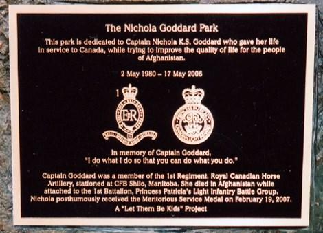 On 15 September 2007 members of the local community and volunteers of the Canadian Forces got together and constructed a park dedicated to the memory of Captain Nichola Goddard. Captain Goddard lived in Sault Ste. Marie at one time and both her grandparents lived there.