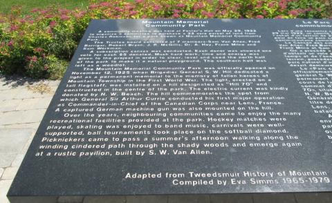 Mountain Memorial Community Park is dedicated to the memory of the citizens of Mountain and Mountain Township who died in the First World War. It was unveiled on November 12, 1925, by the Town of Mountain.
