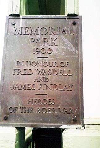 This memorial is in honour of Fred Wasdell and James Findlay, who were killed at the Battle of Paardeberg during the South African War. A plaque is located on the left side of the bandshell steps and was erected in 1900. The bandshell is not the original, nor at it's original location in the park.