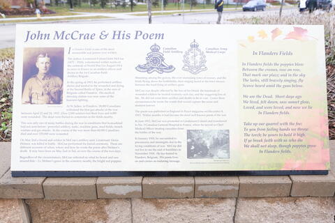 On November 1, 2015, the park was officially dedicated to commemorate the 100th anniversary of the famous war poem, In Flanders Fields. The park features unique walkways and walls made of brick which mimic the trenches in the First World War, poppy beds, a bronze plaque with the poem in the author’s original handwriting, a storyboard with the story of McCrae and how he came to write the poem and another storyboard with the story of how the poem itself became tied to remembrance and the poppy became the symbol of remembrance.