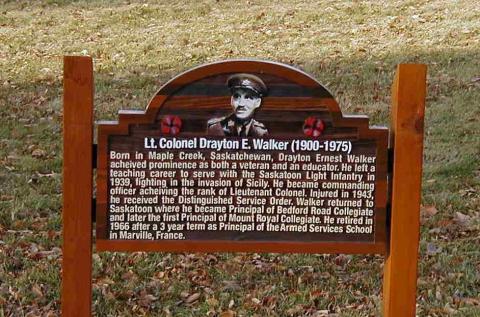 This park is named in honour of Lieutenant-Colonel Drayton Ernest Walker, DSO, Commanding Officer of the Saskatoon Light Infantry during the Second World War. It is located in Montgomery Place, an area developed in 1946 to house returning Second World War Veterans and their families. Most streets and parks in the area are named for prominent military members, famous battles, and military units. Lieutenant-Colonel D. Walker Park was named by the City of Saskatoon in the mid to late 1960s.