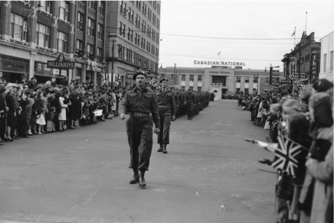 Shortly after Ortona, he was promoted to Lieutenant-Colonel and took over the battalion command in January 1945. In October 1945, he returned home to his family and sealed it with a kiss to his wife, while their three sons stood in the background. His homecoming was photographed and ran on page 5 of the Saskatoon Star Phoenix. The boys hadn’t seen their father since he returned to Canada in 1942 for an instructional tour. After the kiss, soldiers paraded through Saskatoon’s downtown with Drayton at the front, leading his troops one last time.