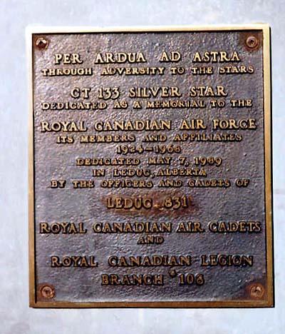 This memorial, a CT-133 Silver Star flown by the Royal Canadian Air Force was originally unveiled on 7 May 1989 by Leduc 831, Royal Canadian Air Cadets, and Royal Canadian Legion Branch No. 108. Dedicated to the former members of the Royal Canadian Air Force, this memorial was rededicated on 7 November 1999 as a memorial to the war dead of Leduc and area.