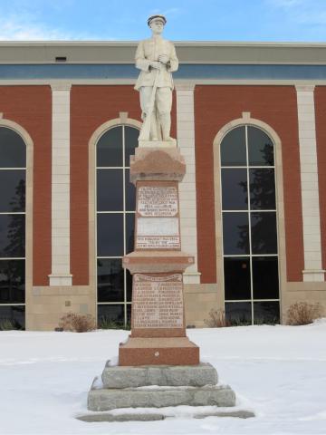 The young soldier stands tall, chest out, holds the barrel of his rifle and gazes solemnly to the south. He is dressed as soldiers often were in the photos taken after enlistment for their families. It was designed by Albert J. Hart, owner of Albert J. Hart, Marble and Granite Works. Located in Calgary, it was one of the oldest marble and granite works in that city. Hart was a skillful and fair businessman who was an expert cutter and designer. He designed several cenotaphs across Canada including those for the City of Medicine Hat and the Town of Nanton.