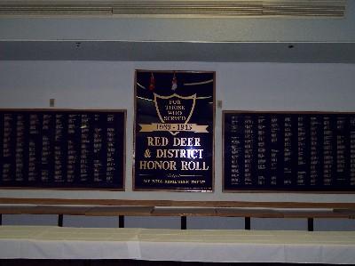 The Red Deer Legion Plaque commemorates those who served in the Second World War. The plaque lists the 1,214 men who served that lived in the Red Deer District at the time of the Second World War, including 26 who were prisoners of War and 52 who never came home. A group of 11 Red Deer veterans of the Second World War presented a massive plaque of three pieces containing honour roll lists, in alphabetical order to the Red Deer Branch of the Royal Canadian Legion. Bill Owen, president of the group, Michael Dawe, and Grace Scott compiled the list of names from the Red Deer Home Comfort Group, an organization of local women who sent care packages to local soldiers overseas. Seniors in the group included vice-president Ron Scott, secretary Florence Edginton, Al Taylor, Seb Neuman, Tom Hoskin, Dennis Scott, Melvin Reay, Ralph Roth, Russell Caton and Ted Caswell. The Red Deer memorial was built by artists from a local company, Wallah Fairway Signs.