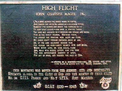 THIS MEMORIAL ALSO RECOGNIZES THOSE PILOTS, MECHANICS AND AIRCREW WHO TRAINED IN CLARESHOLM AND CONTRIBUTED TO THE ALLIED VICTORIES IN EUROPE, THE PACIFIC AND LATER THE KOREAN CONFLICT.