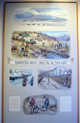 This mural depicts the original construction of the Alaska Highway by the United States Army Engineers.