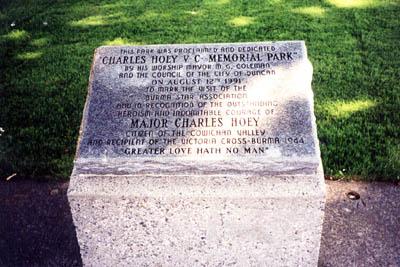 Major Charles Hoey Victory Cross Memorial Park, British Columbia was constructed in 1921 in memory of all those who lost their lives in the First and Second World Wars and Korean War. This monument is the venue for services commemorating the "Battle of the Atlantic", the "Burma Campaign", the "Battle of Britain" and Remembrance Day, November 11. The memorial takes the form of a plain cross. Unveiled on Armistice Day in 1921, it was financed by public subscription and maintained by the City of Duncan. Of the 1066 people from the Cowichan River Valley who joined the Armed Forces in World War I, close to 170 people gave their lives during the war or died because of war-related causes. World War II added seventy-plus names to the list. After World War I, the residents of Duncan joined thousands of Canadian communities who built War memorials. Many people mistakenly believe these memorials glorify war and martial values. They were, rather, an attempt to make some sense, on emotional and spiritual levels, of the death of so many friends, loved ones and comrades.