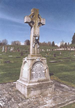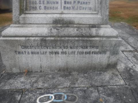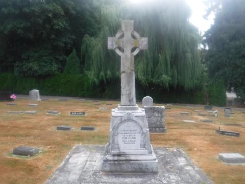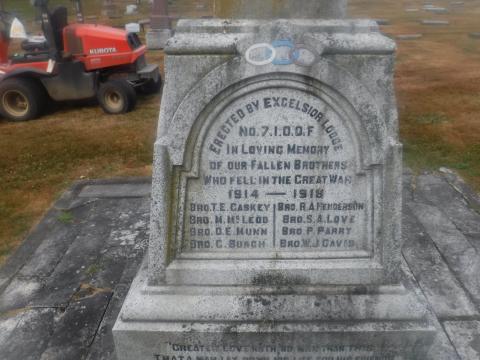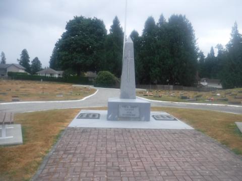 The Independent Order of Odd Fellows (I.O.O.F.) once held an annual Decoration Day where the society's members paraded to the Odd Fellows Cemetery on Little Mountain to place flowers on the gravesites of former members. At the ceremony June 29, 1919 Brother R. Marshall announced that the lodge intended to set aside a plot and erect a memorial to lodge members who had fallen during the First World War. On July 11, 1920 the memorial was unveiled by Grand Master H. Fooks of Agassiz. The memorial is made of granite on a white marble base, and is the shape of a Celtic cross. The three links on the plinth represent the Order while a helmet and crossed rifles reflect the service in which the eight First World War members of the Order had fallen. Their names were T.E. Caskey, R.A. Henderson, D. Munn, M. McLeod, G. Burch, S.A. Love, W.J. Davis and T.H. Parry. Two names from the Order were added following the Second World War; Lorne Clarence Rideout, R.C.A.F. buried in the Royal Canadian Legion Cemetery, Chilliwack and Harry Kennedy Ford, R.C.A.F. buried in the Reichswald Forest War Cemetery, Germany.