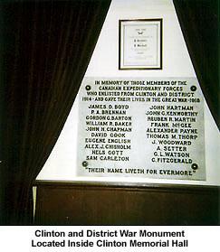 Constructed in 1920 (approx.) in memory of members of the Canadian Expeditionary Forces who enlisted from Clinton and District. The Clinton Memorial Hall was built by the residents of Clinton in the early 1920's as a memorial to World War I forces. All labour and material were donated. The hall is still used today and is maintained by the village of Clinton. The monument is inside the hall and is used each year at Remembrance Day ceremonies on November 11th.