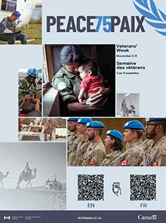 Chaque année, Anciens Combattants Canada produit une affiche originale en vue de promouvoir la Semaine des vétérans. L’affiche vise à rappeler aux Canadiens et aux Canadiennes les sacrifices et les réalisations des vétérans et des gardiens de la paix canadiens, en temps de guerre ou de paix. En nous souvenant de leurs contributions, autant passées qu’actuelles, et en réfléchissant à leur importance, nous renforçons notre engagement à préserver les valeurs au nom desquelles ils ont combattu et péri — la vérité, la justice, la paix, la liberté et le savoir.