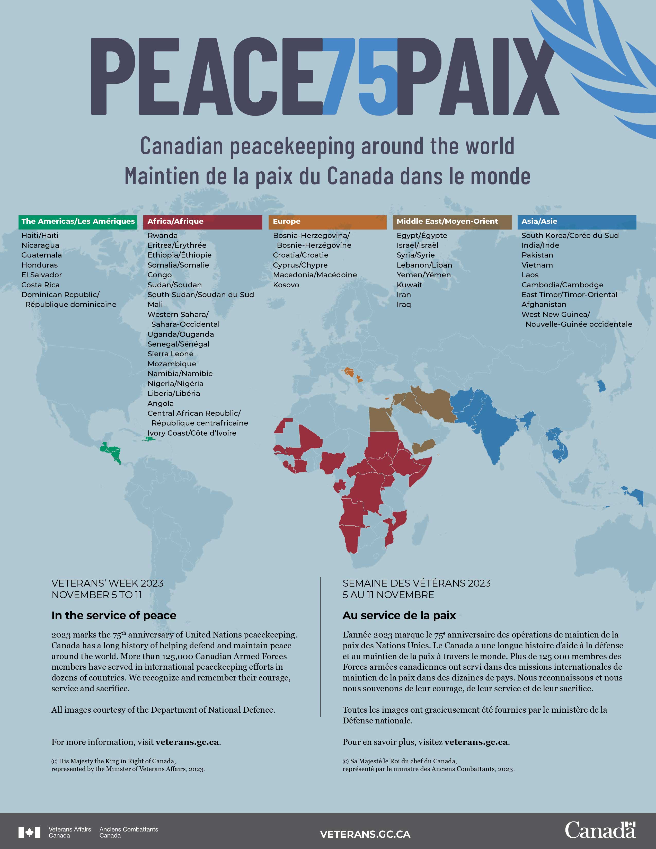 L’année 2023 marque le 75e anniversaire des opérations de maintien de la paix des Nations Unies. Le Canada a une longue histoire d’aide à la défense et au maintien de la paix à travers le monde. Plus de 125 000 membres des Forces armées canadiennes ont servi dans des missions internationales de maintien de la paix dans des dizaines de pays. Nous reconnaissons et nous nous souvenons de leur courage, de leur service et de leur sacrifice.