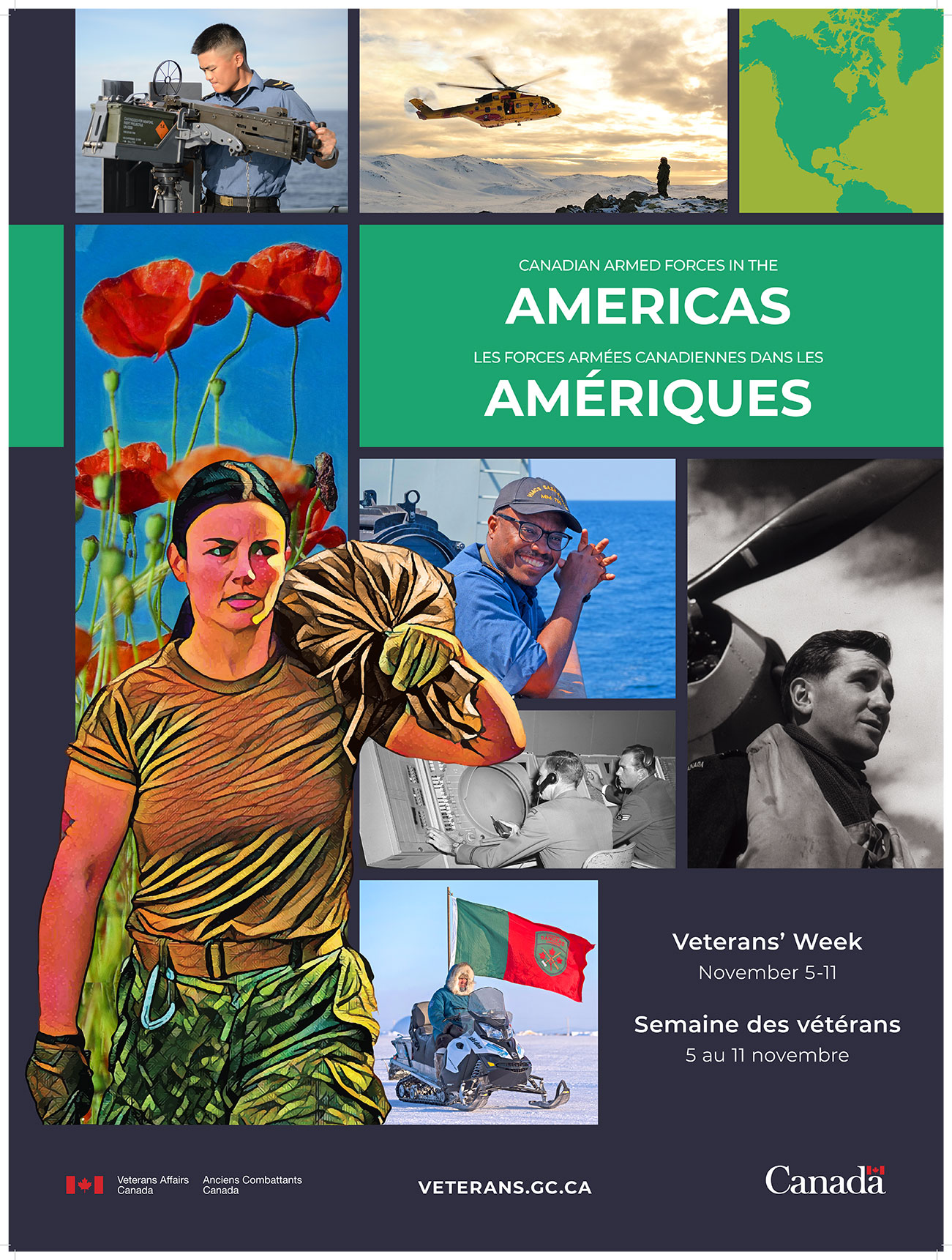 Cette année, nous nous souvenons des réalisations et des sacrifices militaires du Canada, ici et dans les Amériques, et nous leur rendons hommage. Cette affiche commémorative montre des images de militaires canadiens en action au pays et ailleurs dans l’hémisphère occidental.