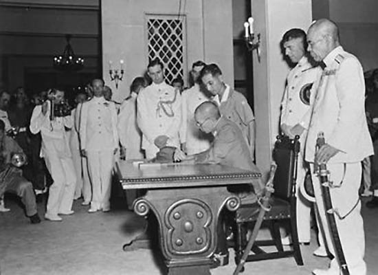 Cérémonie de reddition japonaise – Le lieutenant-général Tanaka signe l'acte de capitulation tandis que le vice-amiral Fujita attend son tour (Government House, le 15 septembre 1945).