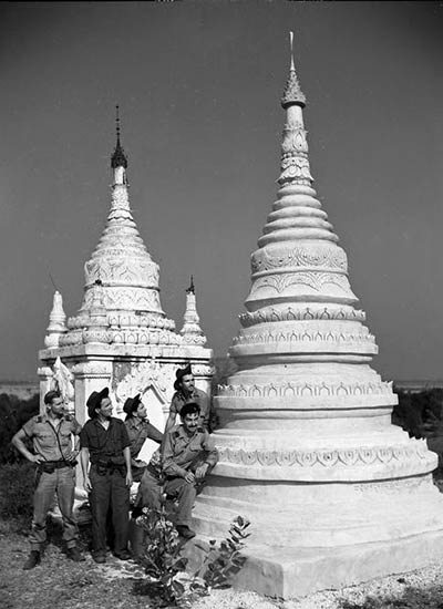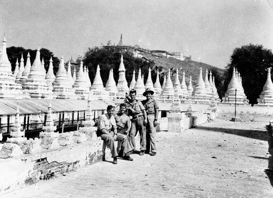 Quatre Torontois en excursion à Mandalay visitent la Place des Mille Pagodes, dont on aperçoit les tours fléchées derrière eux. À l'arrière-plan se profile le Temple Hill qui domine la ville dans toutes les directions. De gauche à droite se trouvent les avc Lee Lodson, Mickey Lane et Tom Maniscola. 435e Escadron. Le 16 avril 1945. Photo : Ministère de la Défense nationale PL 60424