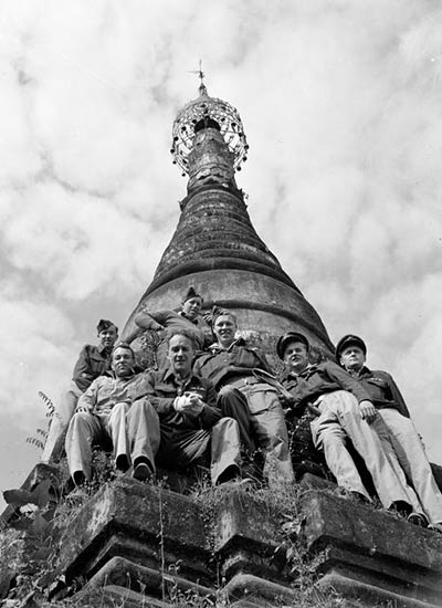 Les membres de l'équipage se sont arrêtés sur la route de Mandalay pour examiner la pagode bouddhiste. De gauche à droite : Dolphin, Simpson, Coyle, Cooper, Gordon. 436e Escadron. Le 17 avril 1945. Photo : Ministère de la Défense nationale PL 60576