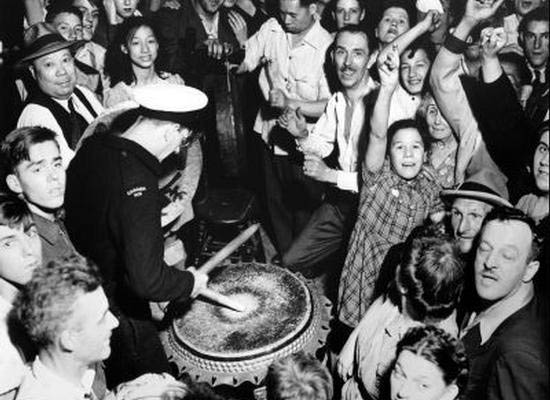 À Montréal, un tambour célèbre le jour de la Victoire sur le Japon avec la foule (le 15 août 1945). Photo : Archives nationales du Canada PA-112810