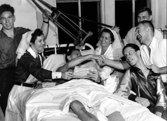 Des soldats blessés qui sont soignés à l'hôpital Christie Street, à Toronto (le 14 août 1945). Photo : Archives de la ville de Toronto, collection du Globe and Mail, Fonds 1266 Item 98378.