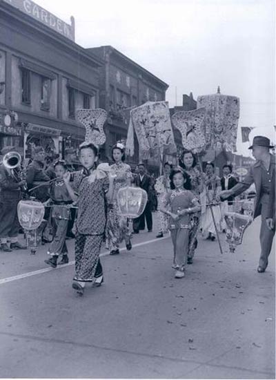 Le défilé dans le quartier chinois, à Vancouver, en Colombie-Britannique (le 15 août 1945). Photo : Archives de la ville de Vancouver/Jack Lindsay CVA 1184-3046