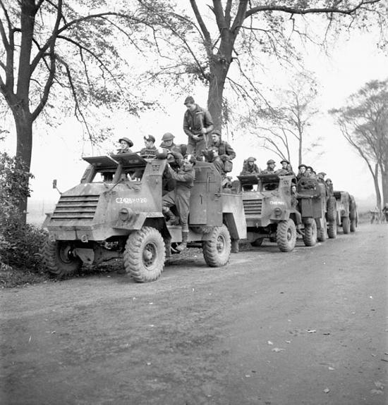 Véhicules de la 3e Division de l'infanterie canadienne traversant Bockhoute, en Belgique, le 18 octobre 1944/Bockhoute, Belgique. Photo : Lieutenant Donald I. Grant (Canada). Ministère de la Défense nationale/Bibliothèque et Archives Canada/PA-137188