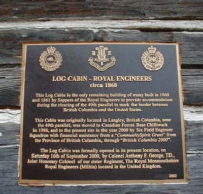 Ce bâtiment en pièce sur pièce du service du Génie, qui date de 1860, se trouvait auparavant à la BFC Chilliwack. Il a été déménagé à côté du manège militaire de l’association du 6e escadron du Génie. Les travaux se sont terminés en 2000. Il a été reconstruit par le 6e escadron après la fermeture de la BFC Chilliwack. Ce bâtiment a été construit par le service du Génie en 1860 afin de loger l’équipe chargée de l’arpentage du 49e parallèle entre le Canada et les États-Unis. Il se trouvait près du 49e parallèle, à proximité de l’actuelle localité de Langley. Il s’agit probablement du seul vestige des bâtiments construits par le Génie en 1860 et 1861 pendant les travaux de dégagement et d’arpentage du 49e parallèle devant marquer la frontière entre le Canada et les États-Unis. C’est le col A.F. George, TD, co-colonel honoraire des Royal Monmouthshire Royal Engineers (Milice), un régiment affilié du Royaume-Uni, qui a inauguré officiellement ce bâtiment en pièce sur pièce sur son site actuel, le 16 septembre 2000.