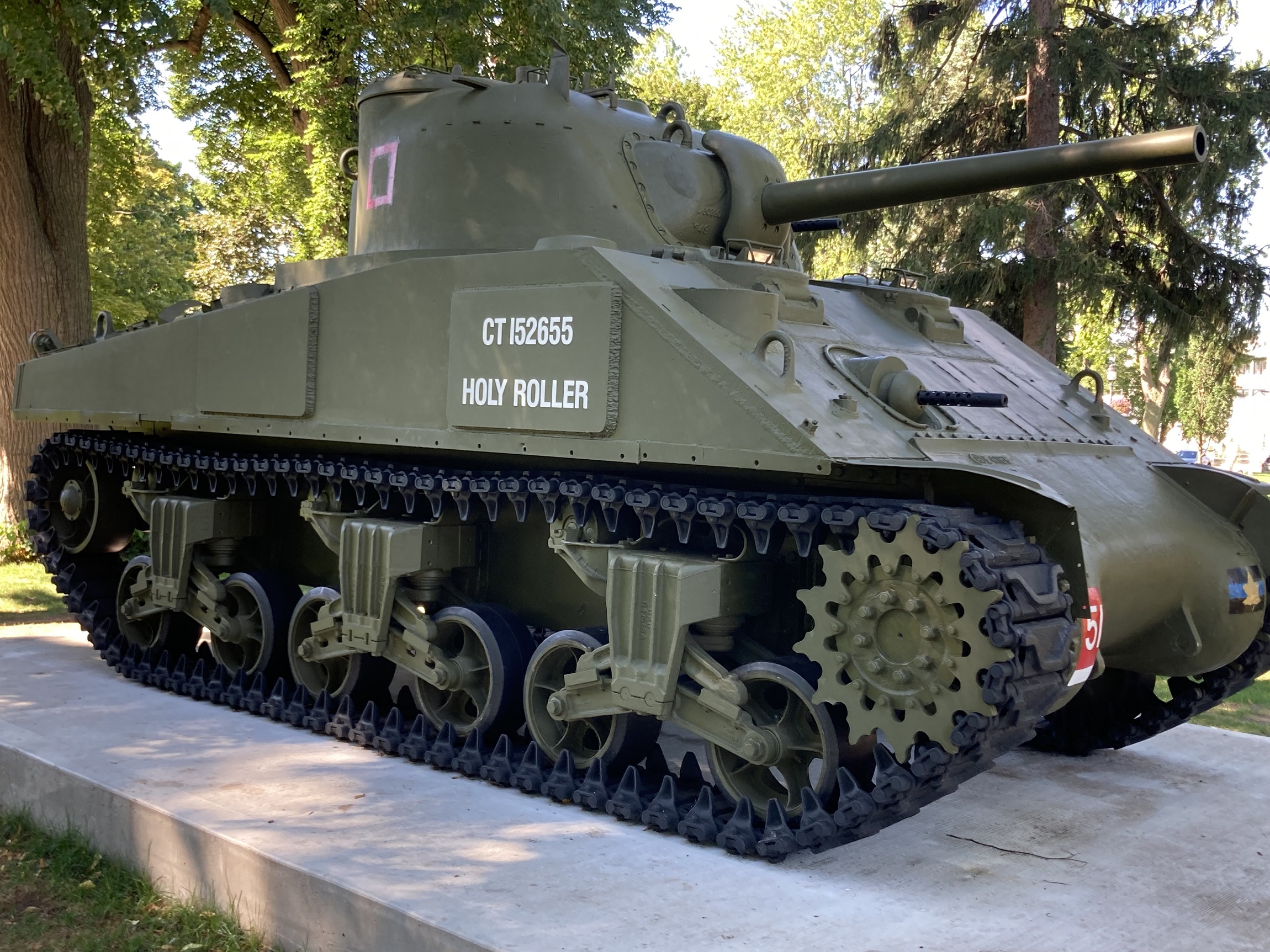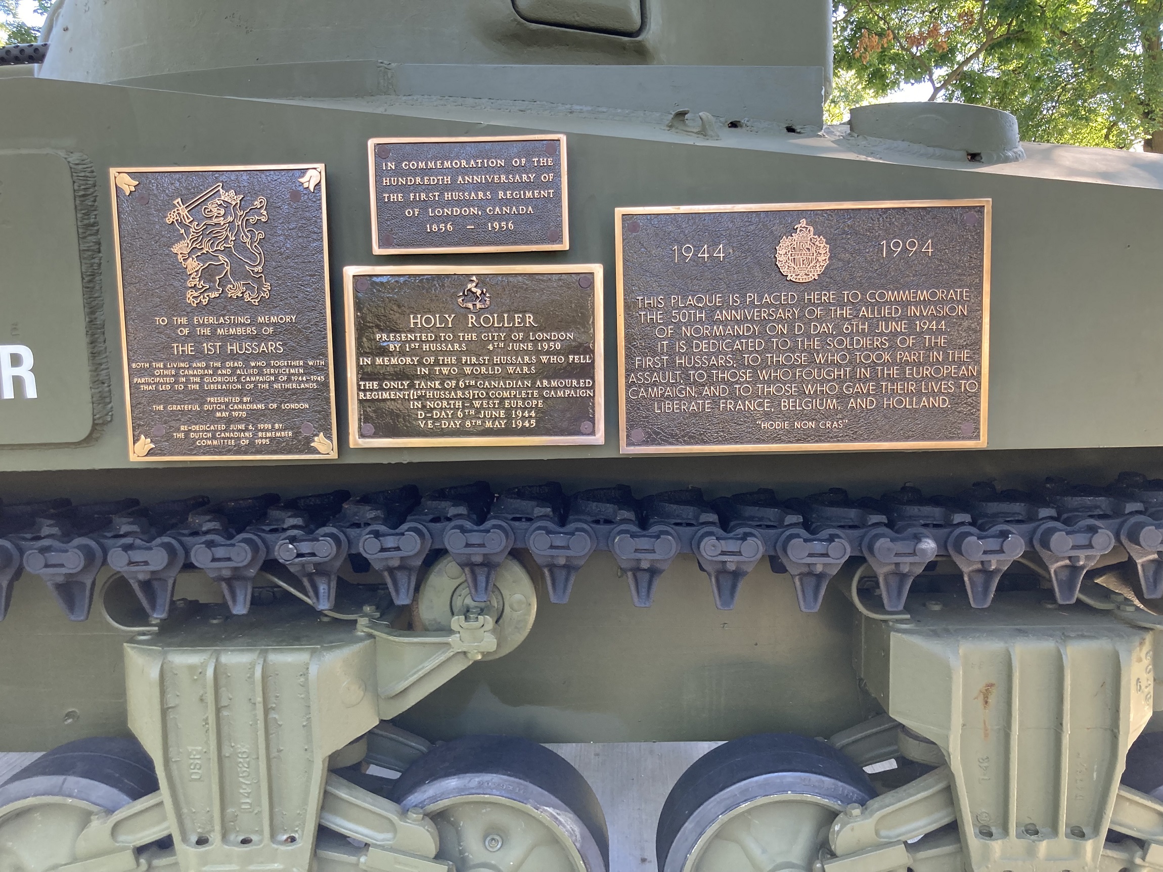 Ce monument commémoratif a été érigé le 4 juin 1950 en l’honneur des membres du 1st Hussars qui ont perdu la vie pendant la Seconde Guerre mondiale. En 1945, HOLY ROLLER a été désigné par les autorités militaires comme un véhicule ayant une valeur historique et sentimentale importante pour le 1st Hussars et, à ce titre, il a pu être rapporté au Canada comme trophée régimentaire.