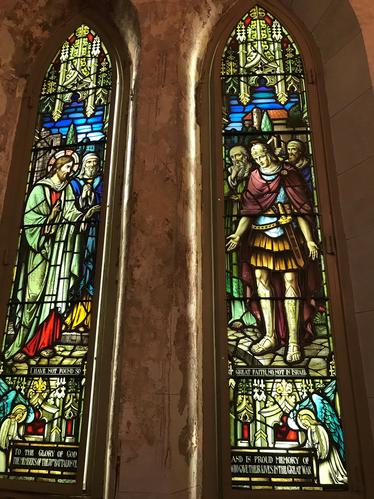 Le vitrail de la Grande Guerre a été créé en 1936 par Robert McCausland Limited, Toronto. Son récit illustre la visite du Christ à Capharnaüm, où un centurion lui demande d’aider son serviteur souffrant. Le Christ indique qu’il se rendra à la maison du centurion. Le soldat précise que le Christ n’avait pas besoin de retourner dans sa maison, car sa parole avait suffi à sauver l’homme. Le Christ admire sa foi et la compare à celle du peuple d’Israël. L’écriture est tirée de Luc 7:9.